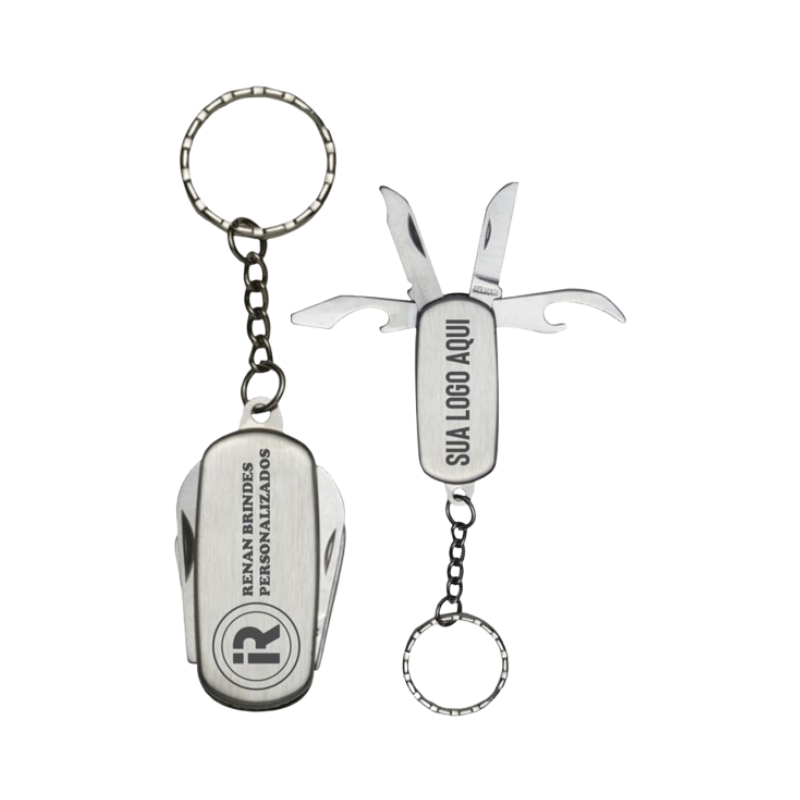 Chaveiro canivete com 4 funções: abridor de lata, lixa, lâmina de corte e abridor de garrafa.